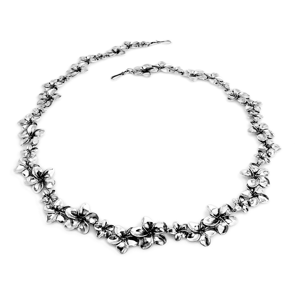 Silver Plumeria Flower Necklace has three lovely different sized silver flowers that wrap around. The silver design is unique and elegant. Handcrafted with sterling silver flowers in Hawaii. This silver necklace can be worn as a statement or casual piece of jewelry. Choose from four different lengths.